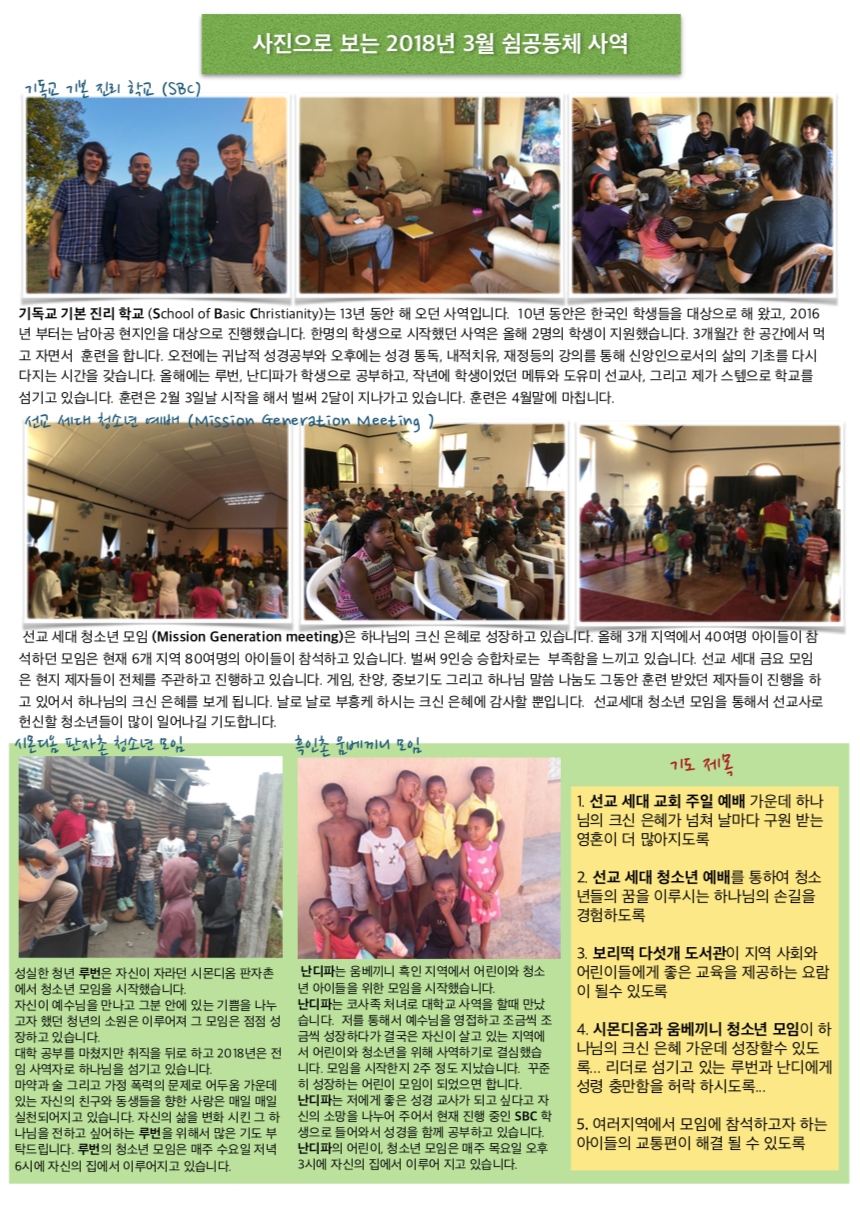 공동생활 집전화 070-7528-7917, +27-21-874-2703 김경래 선교사 전화 : +27-76-583-2900 E-mail : david@sheem.org